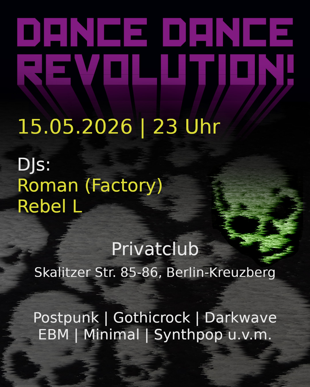 🇩🇪 Die „Dance Dance Revolution“ besteht seit 2014 als bewusst facettenreiche Party. Auf einem Dancefloor finden sich hier alle maßgeblichen Stile der Gothic- und Wave-Szene, so ist für jede*n etwas dabei und man kann sowohl zu bekannten Hits aus mehr als 40 Jahren wie auch zu Raritäten und noch unbekannten Neuheiten tanzen. Für zusätzliche Abwechslung sorgen dabei gemeinsam mit DJ Rebel L regelmäßig wechselnde Gast-DJs anderer bekannter Berliner Partyreihen. So ist die „Dance Dance Revolution“ genau das Richtige für leidenschaftliche und neugierige Musikfans, die gerne neue Songs entdecken und durchaus auch tanzen, auch wenn sie einen Song noch nicht kennen. Die untenstehenden Links geben einen guten ersten Eindruck der musikalischen Bandbreite der Party. Dort finden sich neben den entsprechenden Setlisten auch die kompletten Mixe vergangener Parties zum Reinhören.